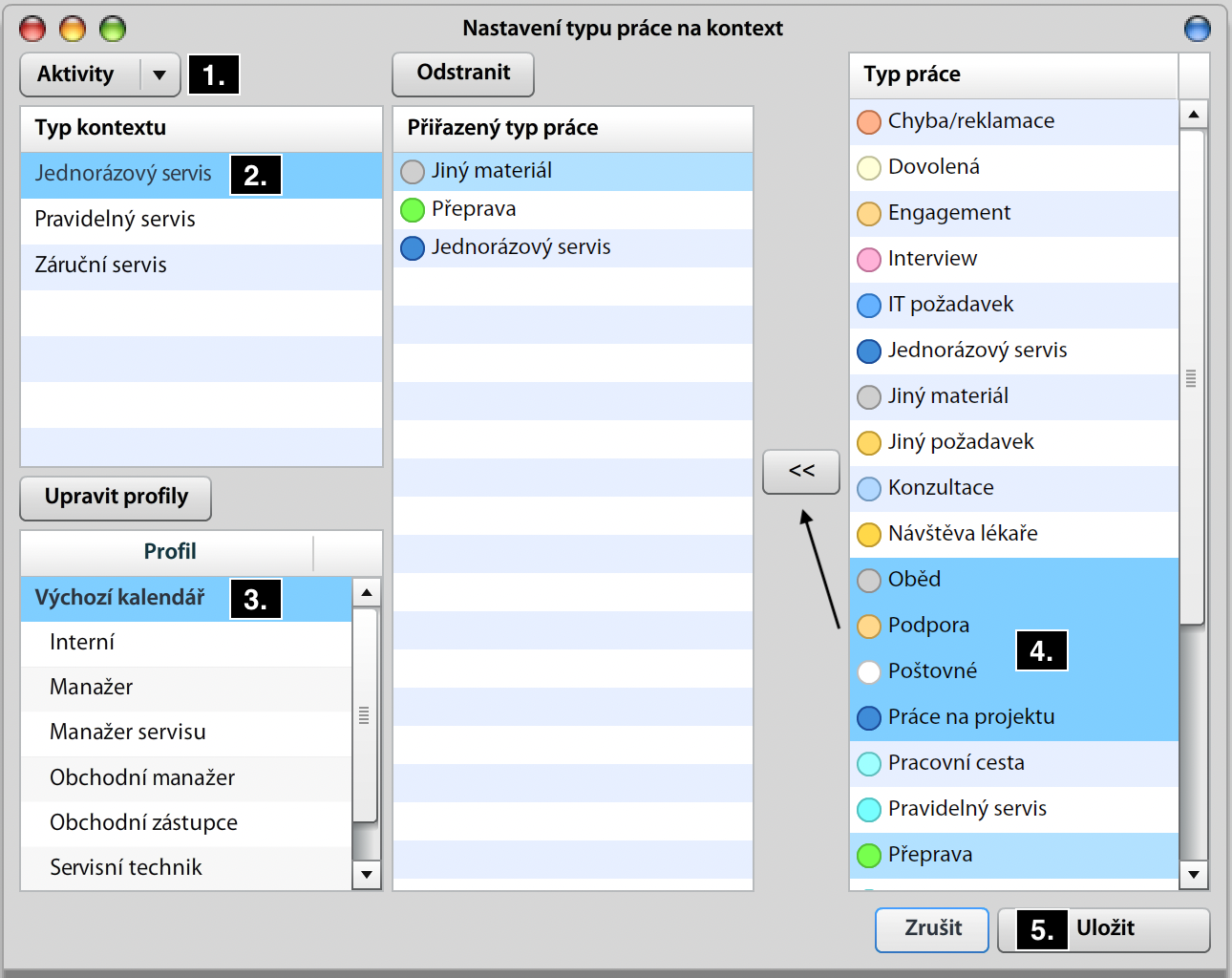 - Je možné označit více typů práce najednou a hromadně je přiřadit k danému kontextu.